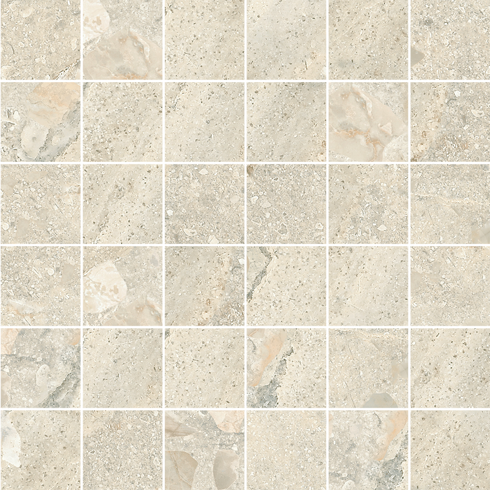 Ghati Mosaic (12" x 12")Natural limestone hues are captured in durable ceramic tile and presented in an easy clean honed finish. Available in two neutral colors, Vintage and Silver, tiles in this series feature a unique fusion of vein and crosscut travertine patterning for the appearance of continuous movement.